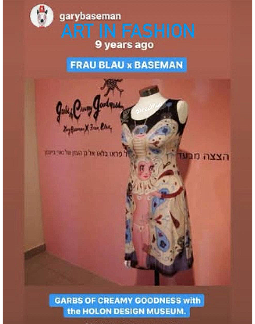 Created as part of the Frau Blau × Gary Baseman collaboration, the dress was presented as an art object at the Design Museum Holon, blurring the line between fashion and fine art.